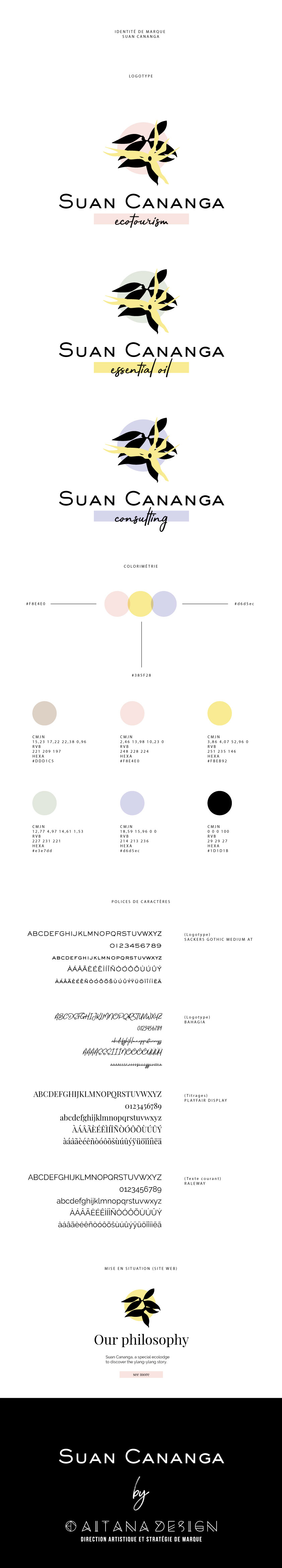 Les couleurs associées traditionnellement à la culture de l’ylang-ylang viennent de la fleur et de son feuillage, un jaune vif et un vert intense. L’enjeu, pour ce projet, était de créer tout un univers visuel doux et raffiné. Les couleurs pastel viennent créer une harmonie, et on se prend déjà à s’imaginer en train de séjourner à Suan Canaga !