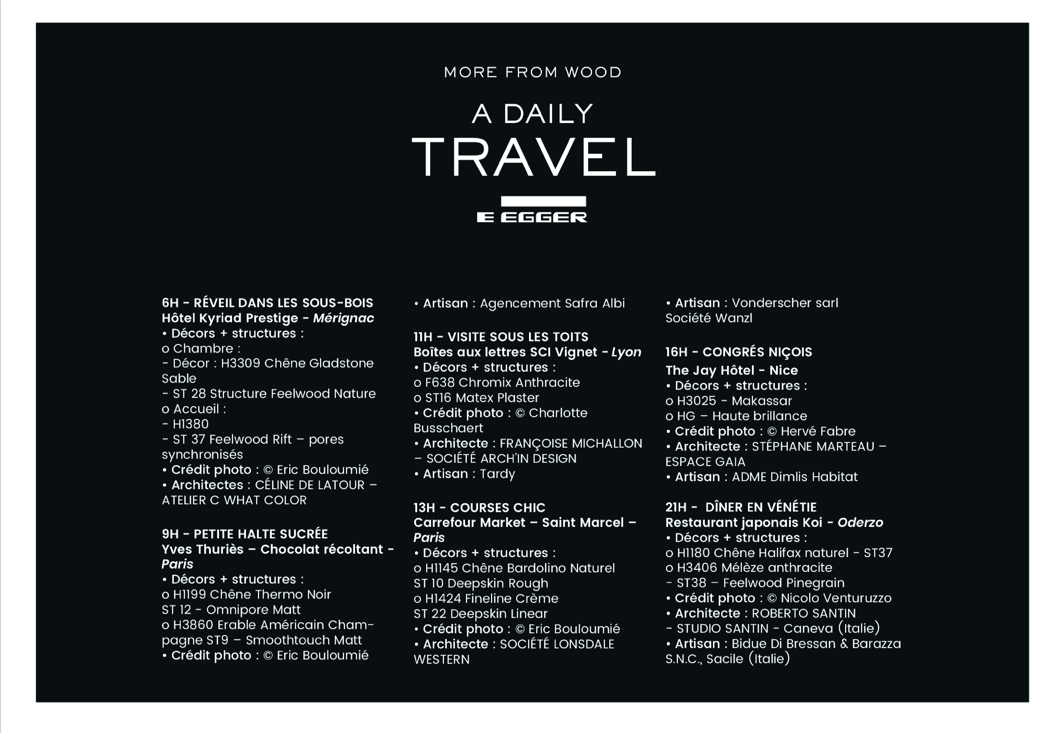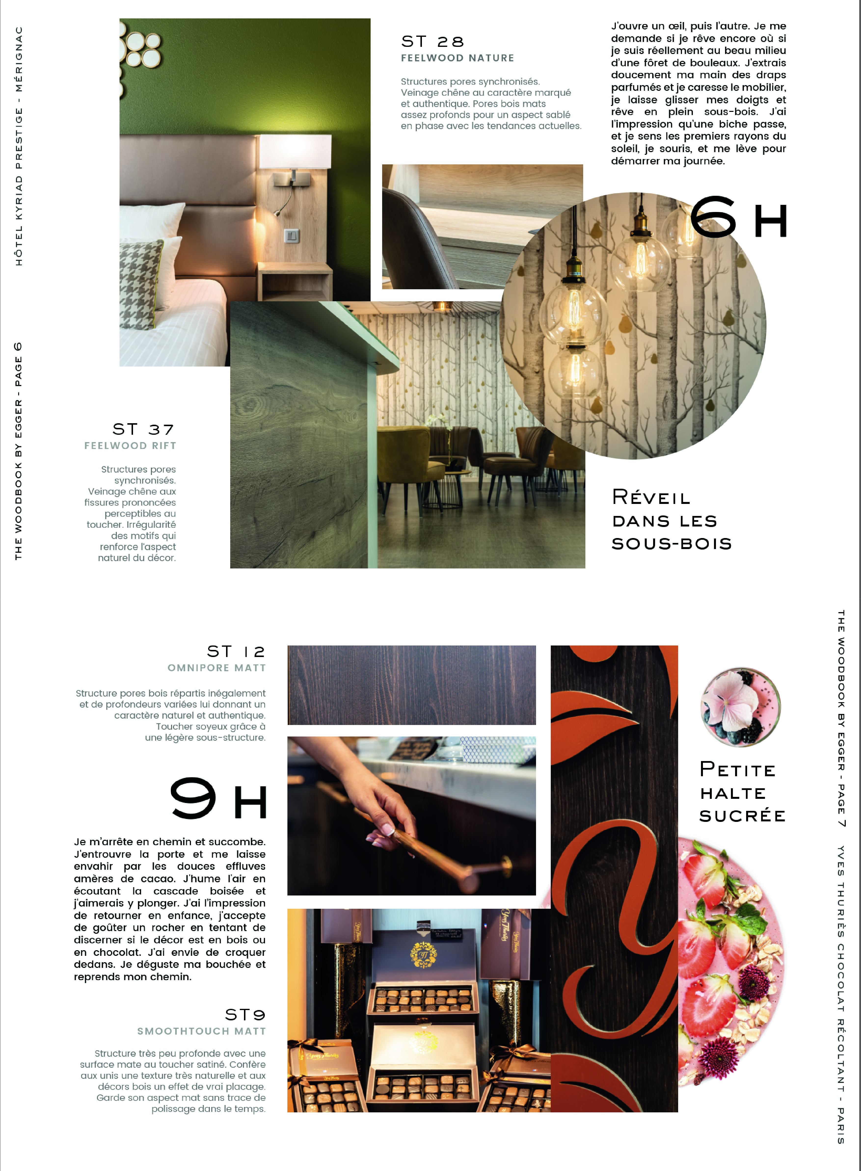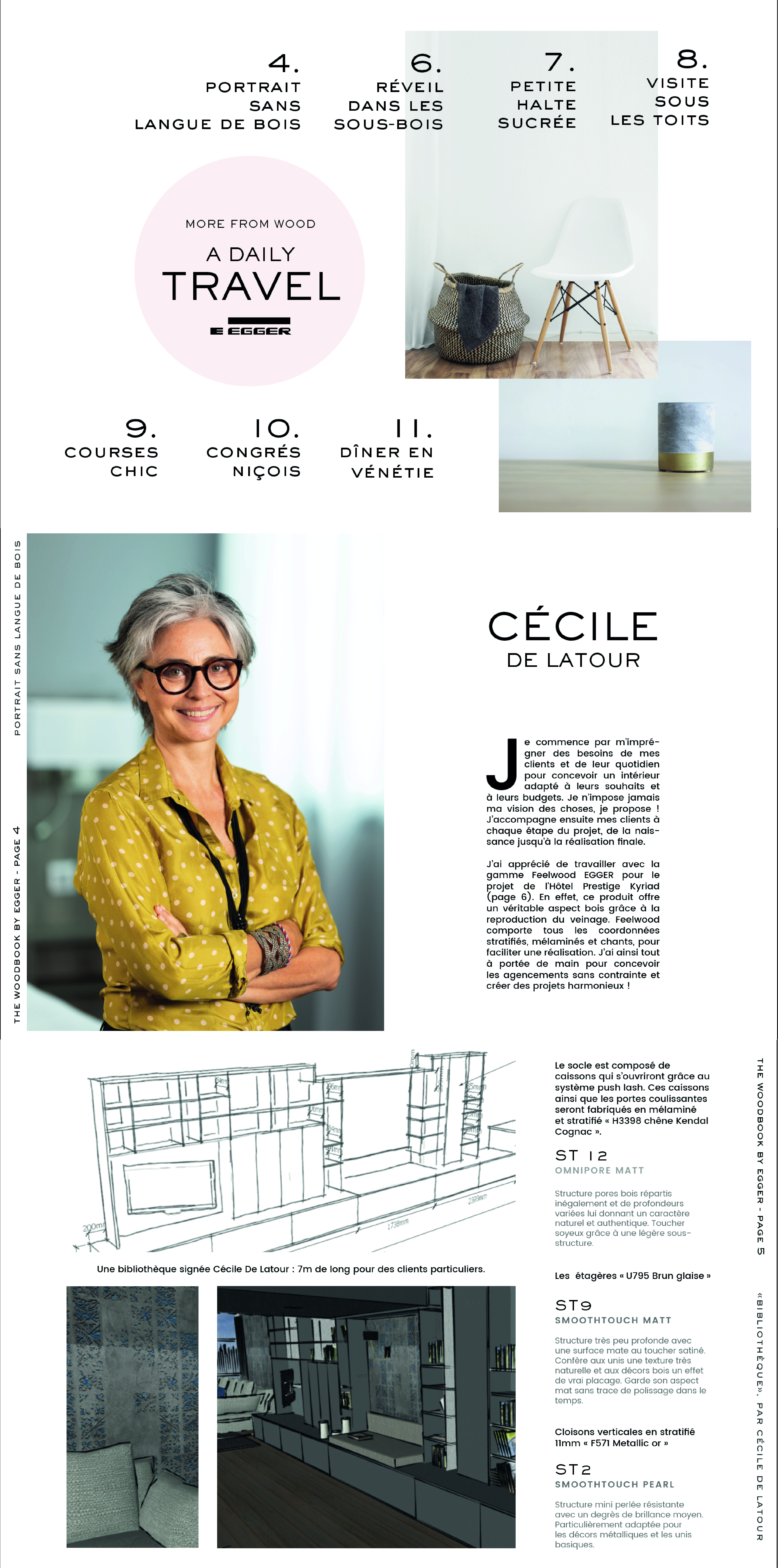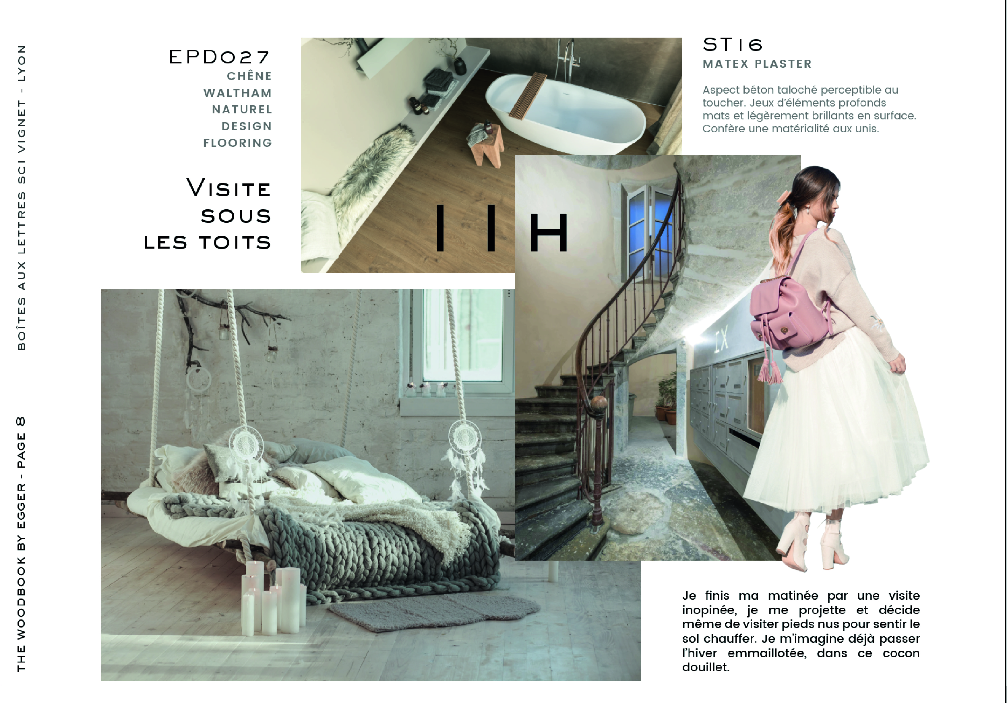 Nous avons travaillé ensemble sur ce nouvel axe : créer une nouvelle histoire avec le bois. J’ai eu carte blanche pour réinventer Egger. Ainsi, j’ai pu réaliser le story-telling, la nouvelle grille de mise en page et le virage visuel. Seul le trait rouge iconique et les références produits ont été conservé. Façon moodboard, chaque planche est un univers visuel dédié, et les pages se déroulent au rythme d’une journée. Les produits sont mis en situation et le lecteur se prend à rêver d’un séjour en Italie ! Moderniser un catalogue aussi réputé était une magnifique occasion de s’amuser : respecter les codes visuels ancestraux et affirmer le nouveau positionnement de la marque européenne.