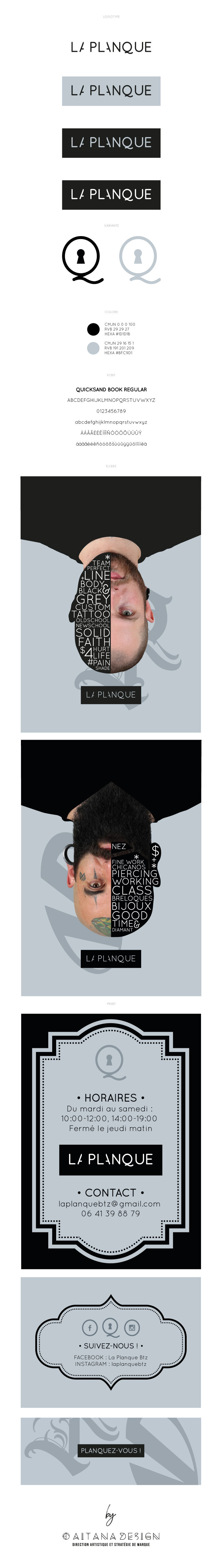 Aïtana Design a travaillé sur toute l’identité visuelle de La Planque pour créer une image de marque harmonieuse. Les deux artistes souhaitaient un univers visuel dans les tons bleutés, avec du noir et blanc. Tous deux possédaient déjà un logo pour leurs travaux respectifs. Ils voulaient également pour La Planque faire la part belle à la typographie en misant sur des densités de mots-clés avec une police d’écriture qui ne connote aucun style habituel du tattoo. Une typographie neutre, en soi, qui mette en avant uniquement leurs créations, ou leurs têtes pour les flyers. Nous avons ensuite décliné ce principe graphique de l’immense vitrine du shop jusqu’aux cartes de fidélité !